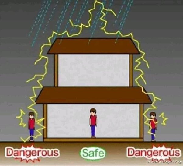 - Posisi berlindung hendaknya beberapa meter dari jendela yang terbuka, tempat cuci piring, toilet, bak air, shower, kotak listrik dan peralatan lainnya. Karena petir dapat merambat melalui peralatan di atas dan melompat untuk mengenai orang-orang yang berada disekitarnya.